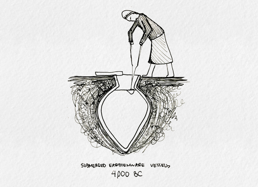 4,000 BC in Israel, Georgia, Armenia, and Iran, winemaking facilities have been discovered with large earthenware vessels submerged in the ground. Today Georgia still practices winemaking in earthenware vessels called Kvevri.