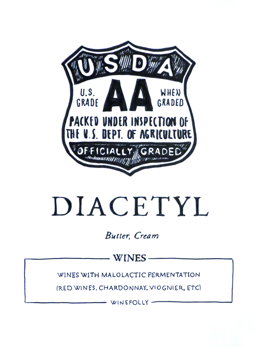 This compound is much more pronounced in white wines but adds an aspect to red wine that’s often described as creamy or velvety. Diacetyl comes from the post-fermentation process called Malolactic Fermentation which involves bacteria eating malic acid and pooping out lactic acid (sounds delicious right?). The result gives wine this awesome creamy and buttery aroma and texture. By the way, very few white wines undergo this process which is one of the primary reasons they taste so much different than red wines.